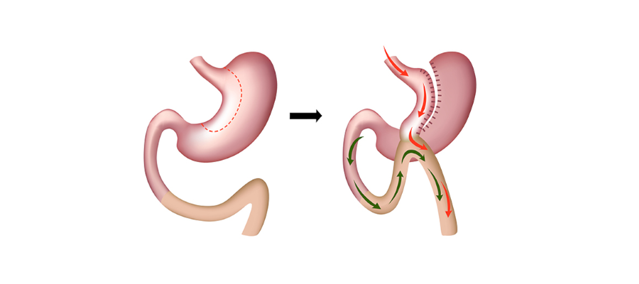 Bei diesem Verfahren wird der obere Teil des Magens zu einem dünnen Schlauch (Größe 30 ml bis 50 ml) geklammert. Der neue dünne Schlauch wird zum kleineren Magen und ist vollständig vom Rest des Magens getrennt. Dieser Magen wird dann an eine Dünndarmschlinge genäht, wobei der erste Teil des Darms, der Zwölffingerdarm genannt wird, und etwa 150-200 cm des Darms umgangen werden. Der Rest des Magens und der obere Teil des Dünndarms verbleiben im Körper, werden aber nicht mehr zur Nahrungsverdauung verwendet.